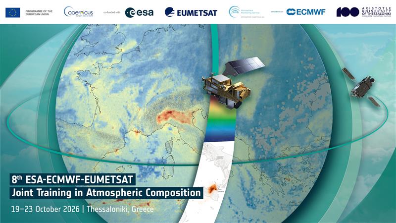 The European Space Agency (ESA), the European Organisation for the Exploitation of Meteorological Satellites (EUMETSAT), the European Center for Medium-Range Weather Forecasts (ECMWF) with the Copernicus Atmosphere Monitoring Service (CAMS) are organising the Eighth annual Joint Training on Atmospheric Composition, hosted by the Laboratory of Atmospheric Physics, School of Physics, Faculty of Sciences, Aristotle University of Thessaloniki, Greece from 19 to 23 October 2026. Greece from 19 to 23 October 2026. The course builds on nearly a decade of rich heritage, and past examples of trainings, including pre-training webinars can be found in the following sections of this website.